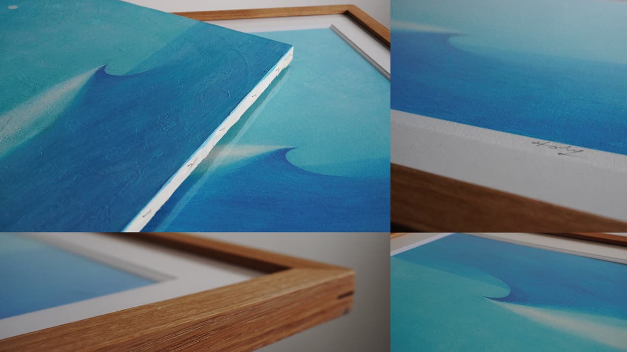 「ジクレー」はフランス語のGiclée(吹き付けるの意)由来の言葉。“ジクレー版画”とも呼ばれ、新しい絵画の複製版画技術として注目されており、美術作品を高精度のアートスキャナーでデータ化し、版画専用紙に特殊プリンターを用いてインクを吹き付ける複製画です。WAVEのジクレーも、他の作家のジクレー作品と同様に何度も色校正を行い、堀内氏がその仕上がりをチェックし、認証サインを入れたものだけを商品化。印刷機のプリントよりも遥かに高品質で、アート作品としての価値があるものとなります。THE SECRET BEACHで取り扱いの「WAVE」のジクレーは、サイズ縮小せずに、原画サイズそのままの大きさで、氏の筆のタッチが描き出す波の迫力と静寂感をお届けします。また、南伊豆で活動する気鋭の木工作家によるフレーム(受注制作)とマットをセットにした[南伊豆コンプリートキット 価格 ¥57,000(*税抜 送料別途)]でのご注文も承ります。詳しくはお問い合わせください。